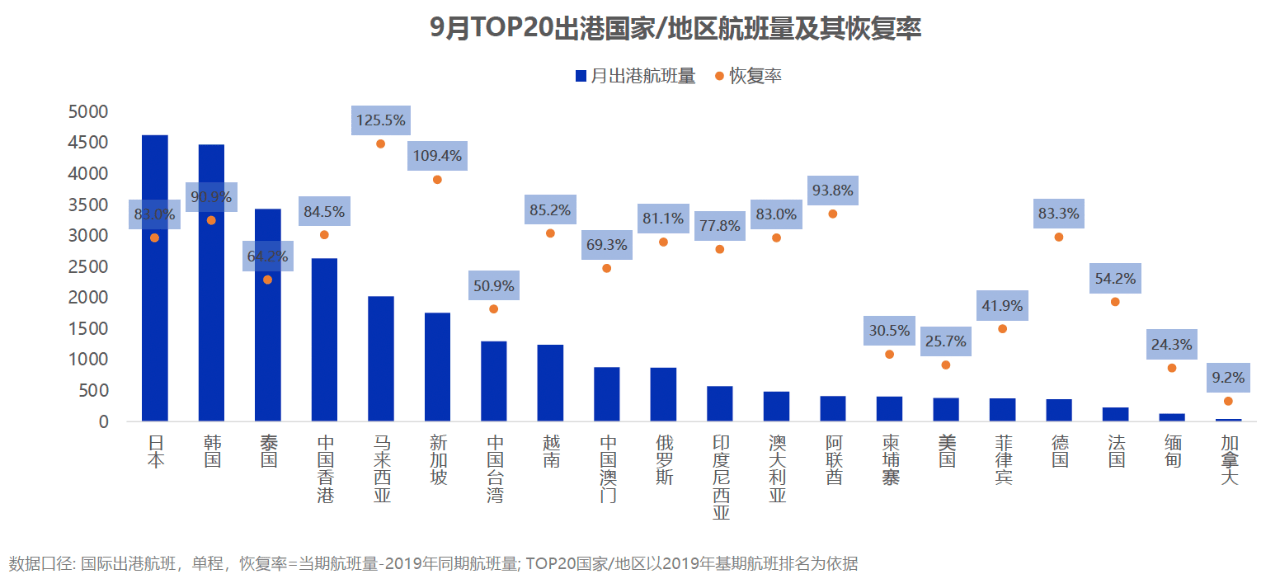 航空分析公司Cirium的数据显示,今年3月,中加航班仅有41趟,与2019年同期相比减少9成。此外,航班管家的通航数据指出,截至今年9月,前20个主要出港国家和地区的航班量及恢复率排名中,加拿大位居末尾。