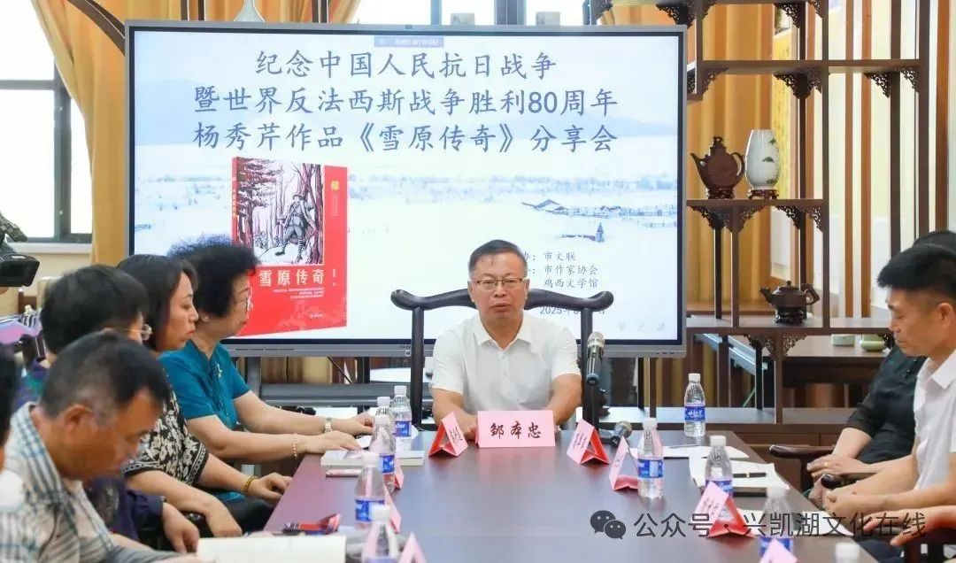 为纪念中国人民抗日战争暨世界反法西斯战争胜利80周年,开展好第二届龙江之夏文学周鸡西作协系列活动,由市文联主办、市作协承办、鸡西文学馆协办的杨秀芹作品《雪原传奇》分享会于8月7日圆满举行。众多文学爱好者齐聚一堂,共同围绕杨秀芹的抗战题材新作展开深入交流,重温那段波澜壮阔的历史岁月。