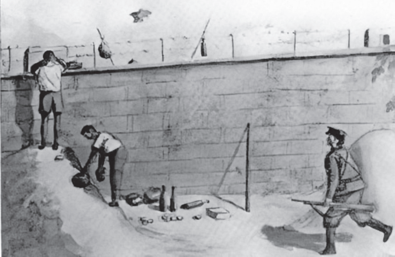 采办物品不易,如何把这些物品传送到侨民手中则更难。乡民们得冒着莫大的危险,在约定的时间——晚上10点之后,从事先侦察好的铁丝网底下钻进来,再爬过一道一米半深的壕沟,才能靠近集中营的墙根。为了避免发出太大的声响招来荷枪实弹的巡逻队,乡民们想出了一个办法——用长竹竿挑起包袱送过墙头,让墙内的人站在土包上接过去。一边是一个一个挑送,一边是一个一个接收,悄没声息地进行,居然持续了很多日子都没有让日军看守发觉。