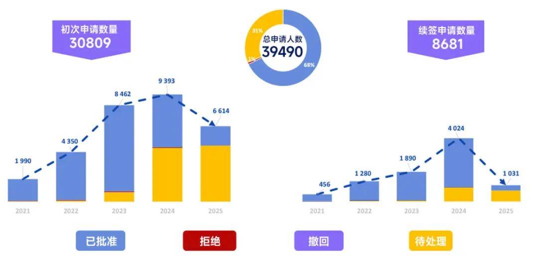 在2021年至2025年11月期间,希腊黄金签证项目累计接收了39490份申请,其中26853份已签发,12296份待办。其中,2024年11月24日至2025年11月25日共接收了10657份黄金签证申请,目前已有3629份已获批。